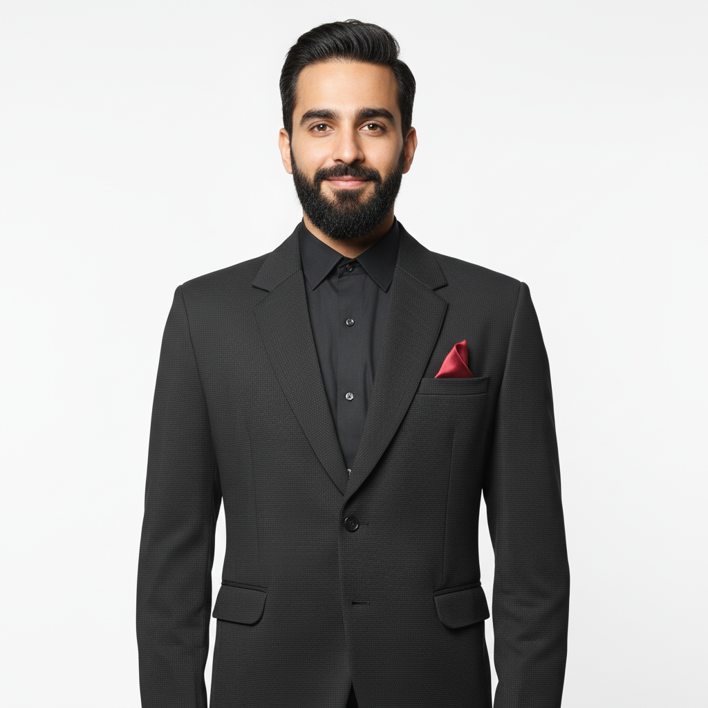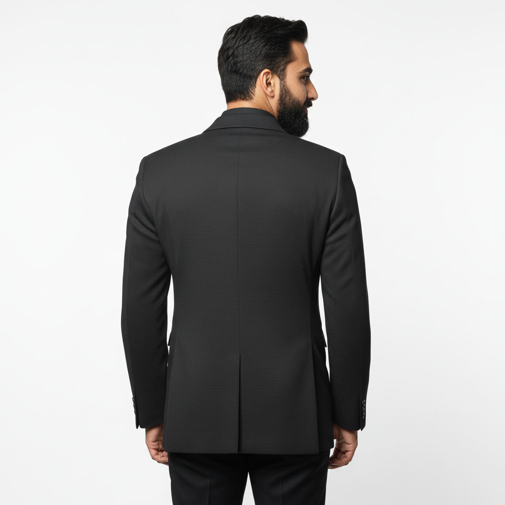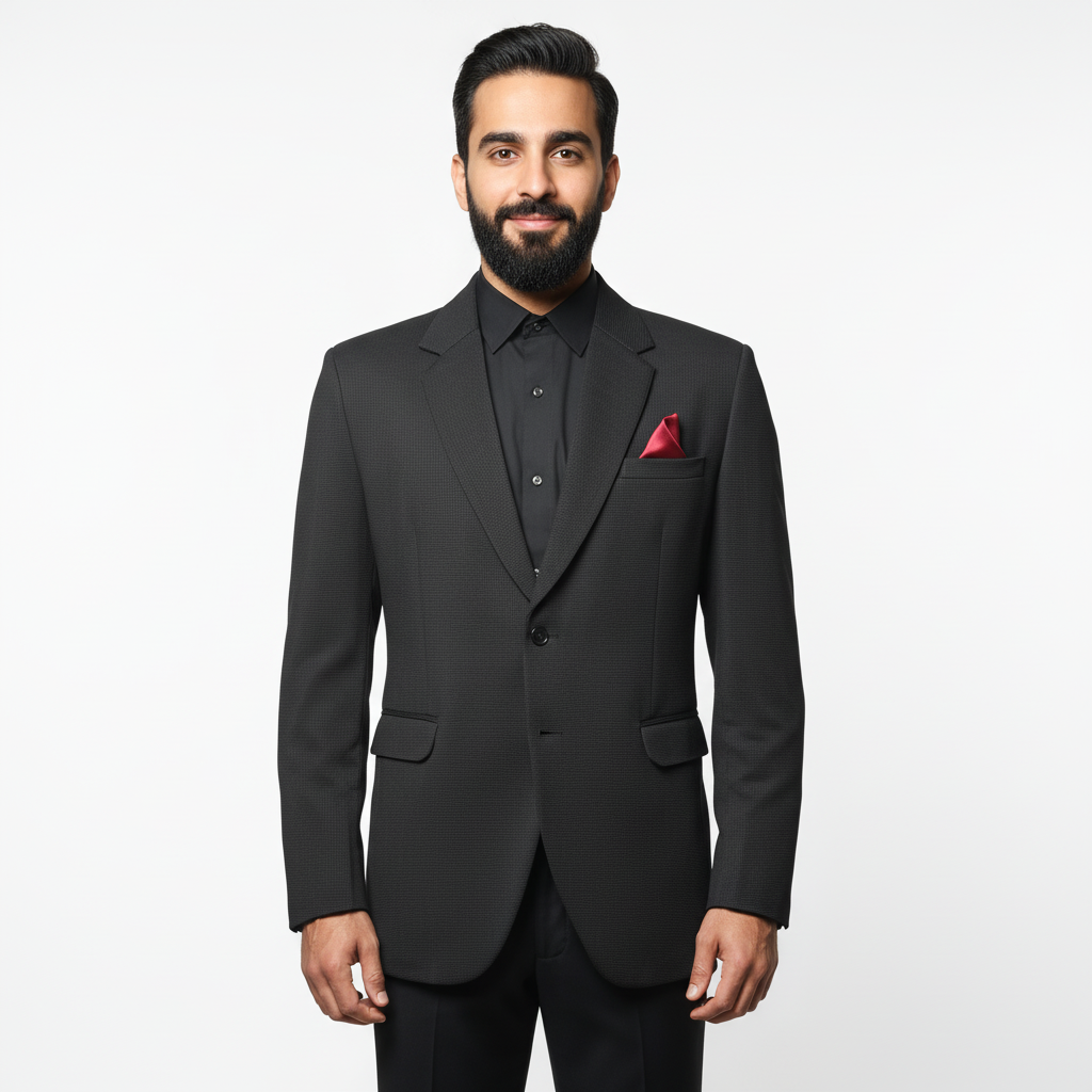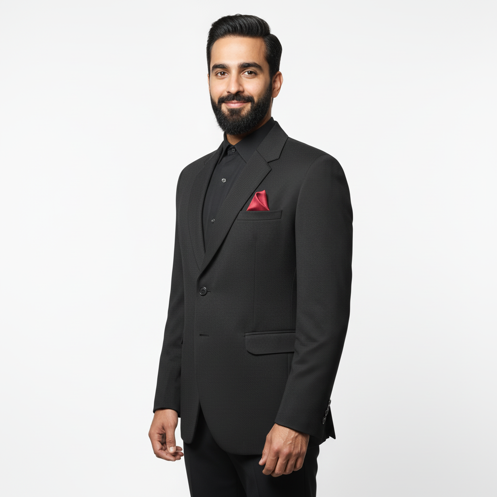 A premium black textured blazer tailored in a slim fit, featuring a refined matte finish and contrast pocket square detail. Ideal for formal, party, and evening wear.